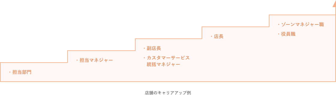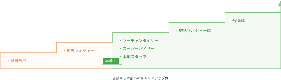 店舗の仕事は4段階に分かれていて、徐々にキャリアアップしていきます。 キャリアアップの途中で本部スタッフになる場合、本部スタッフから店舗に戻る場合もあります。