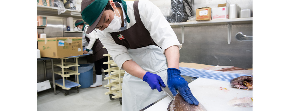 鮮魚は、加工技術の善し悪しが商品の品質にはっきり表れる商品。魚の身の切り方一つで見た目も美味しさも大きく変わってくるのです。そこが私にとっての鮮魚の面白さ。今でもメンバーさんたちをサポートして自分で毎日包丁を握っています。