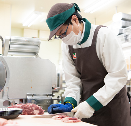 一般的なスーパーマーケットでは、お店に配送されてくるパック済みの肉をそのまま売場に並べることがほとんど。ところがヨークベニマルでは、お店の中で自分たちで肉を加工・調理しているのです。なぜなら、とことん味と鮮度にこだわったお肉をお客様に届けたいから。私自身、精肉部門のマネジャーになった現在でも加工機械を駆使して肉を切っています。