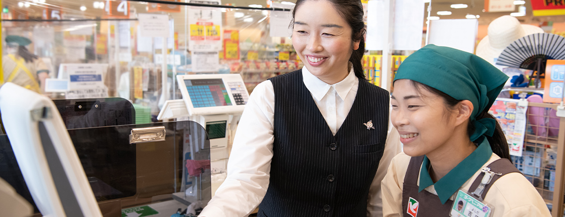 私が携わるCS(カスタマーサービス)は、その名のとおり、レジまわりをはじめお客様へのサービスに関わる部門。けれども、それだけに留まらないところが、いかにもヨークベニマルらしいと思います。各店には、CS部門のリーダーとなる統括マネジャーがいます。彼女達の仕事は、お客様サービスに関することに加えて、従業員の採用や教育まで幅広く責任も重い。つまり、人と人に関わることすべてが仕事なのです。私は現在、このようなお店のCS部門をサポートするCSトレーナーとして茨城南ゾーンの17店舗を担当しています。